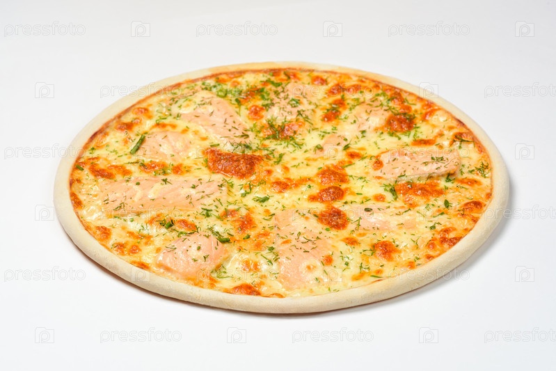 Пицца с копченым лососем, зеленью и сыром моцарелла на белом фоне
