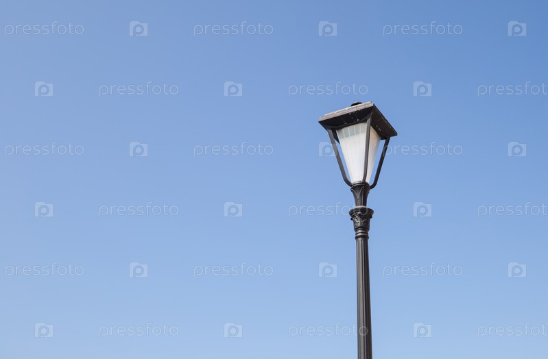 Уличный фонарь в черном с одной лампой в античном стиле на фоне голубого неба