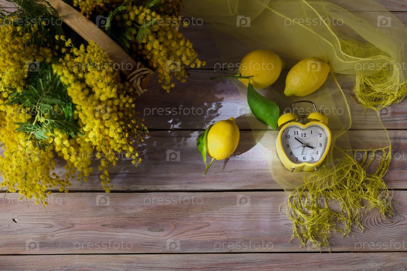 Натюрморт с желтыми часами, лимонами и свежими ветвями мимозы
