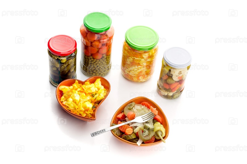 Различные маринованные овощи на белом фоне