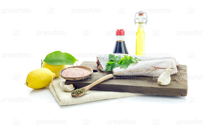 Два куска сырой трески на белом фоне
