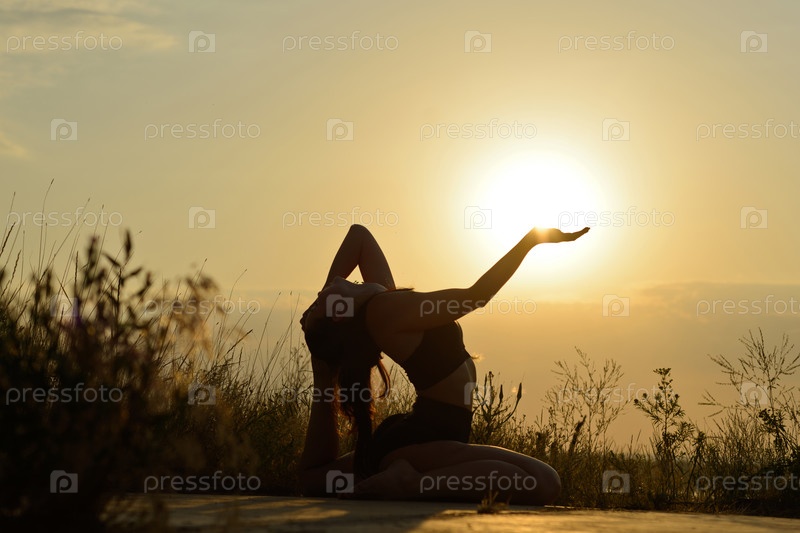 Женщина практикует йогу на фоне гор и неба
