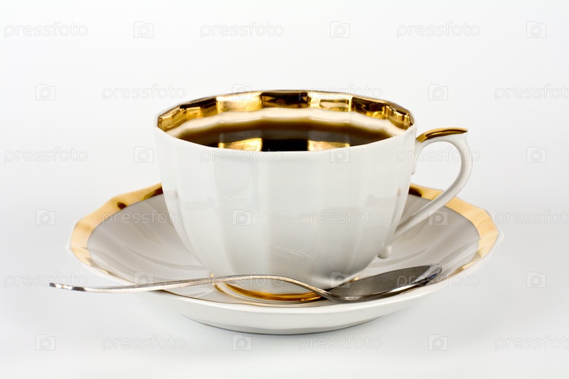 Чашка кофе с блюдцем и ложечкой на белом фоне