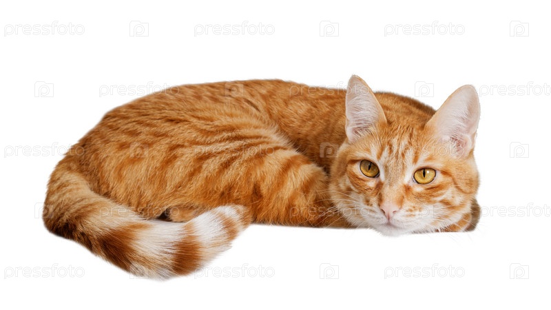 Лежащий рыжий кот на белом