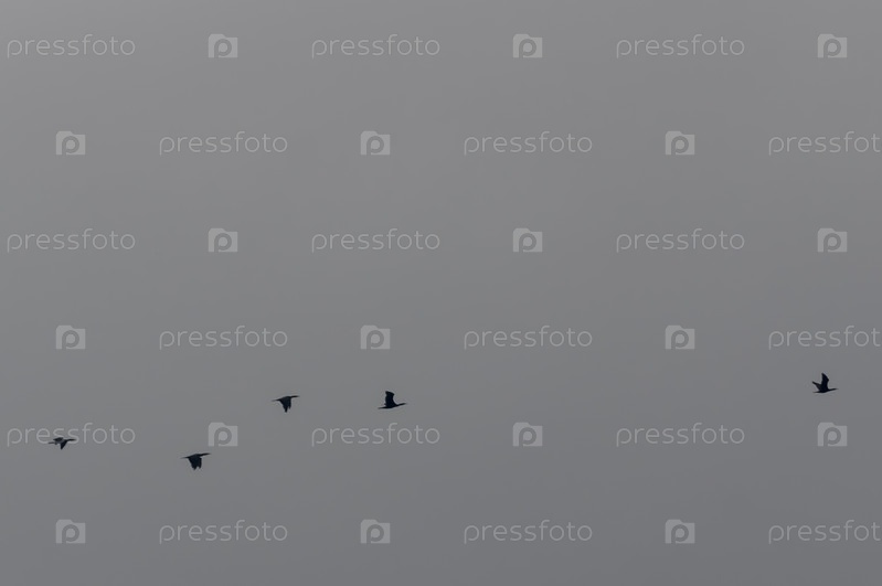 Стая птиц летит на фоне серого неба