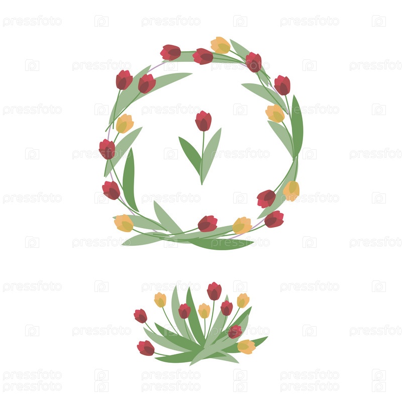 Венок из красных и желтых тюльпанов с зелеными листьями