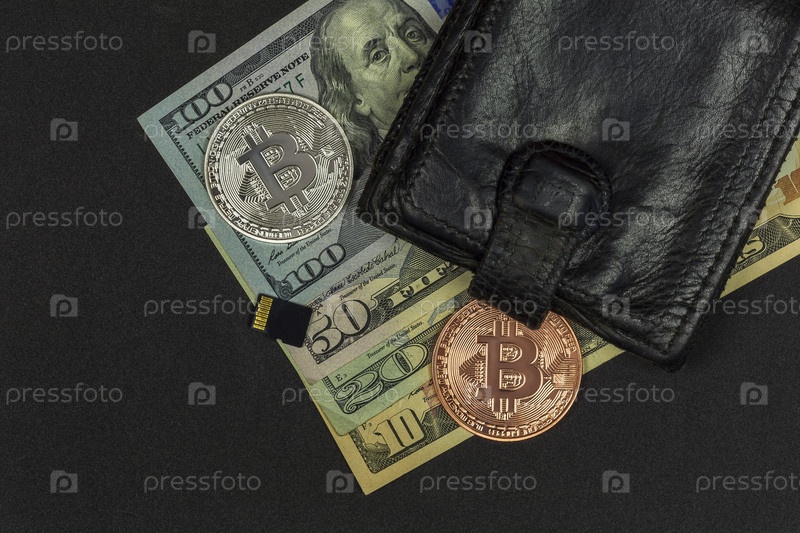 Кошелек с деньгами, флэш-накопитель и биткоин