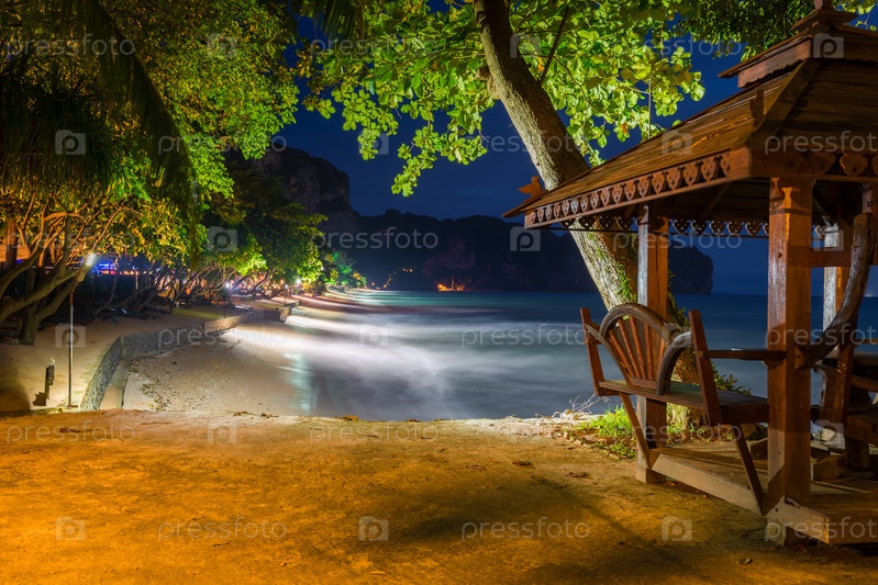 Деревянная беседка на берегу моря и ночной вид на курорт Краби, Таиланд