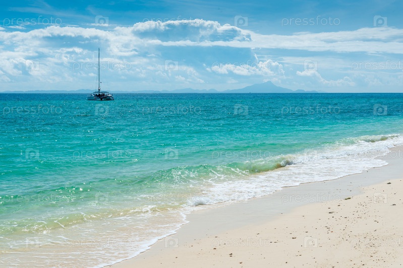 Бирюзовая вода, белый песок и лодка в море, Под, Таиланд
