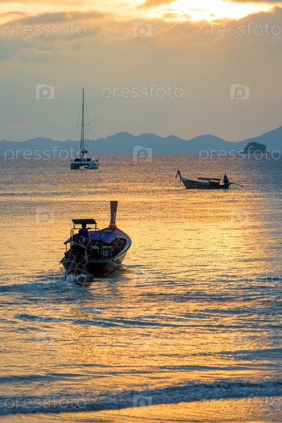 Тайские деревянные лодки в лучах заходящего солнца