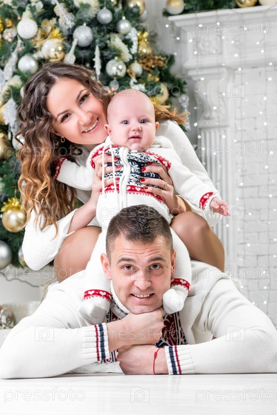 Счастливая молодая семья с сыном возле рождественской елки