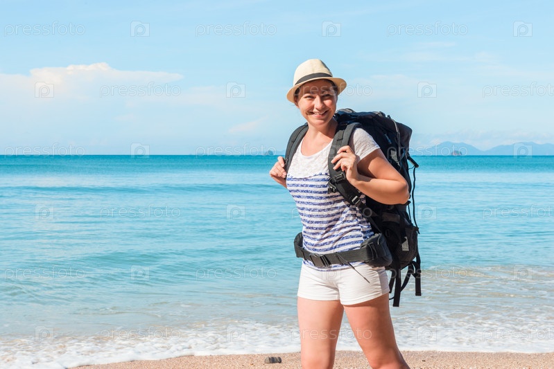Женщина турист с большим рюкзаком на фоне красивого моря в Таиланде