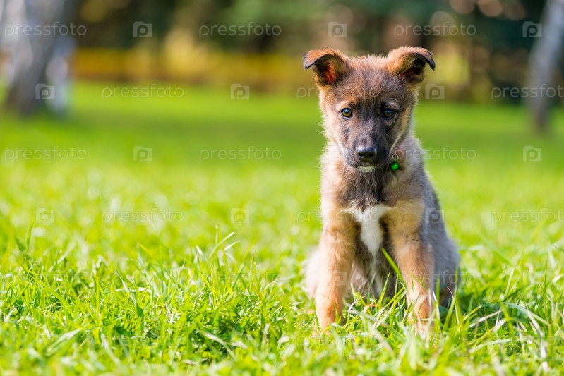 Портрет щенка в парке на зеленой траве в летний день