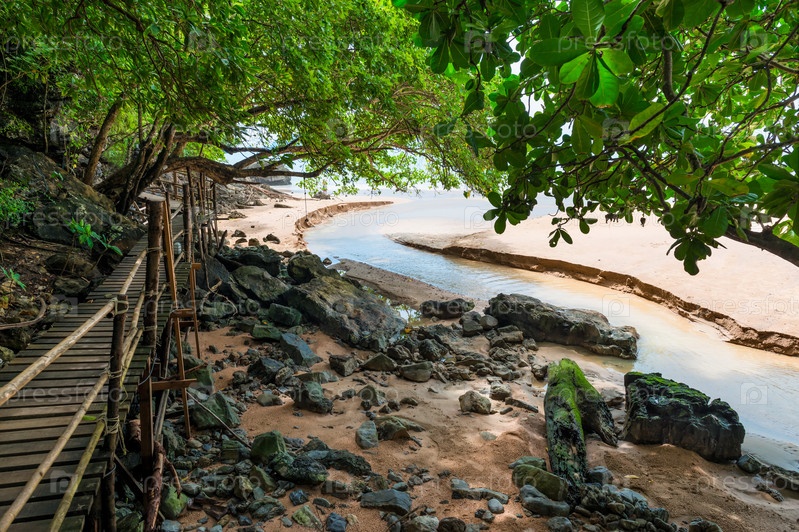 Деревянный пешеходный маршрут в тайских джунглях близ устья реки