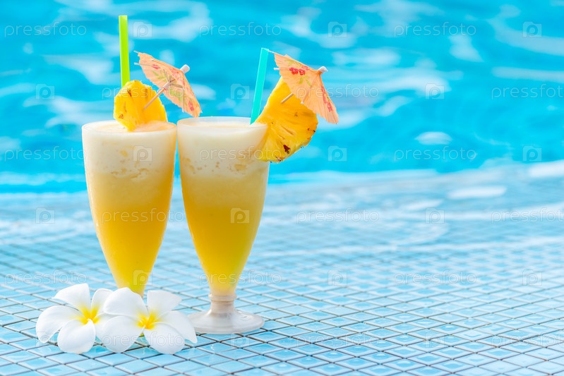 Вкусный ананасовый коктейль на краю бассейна