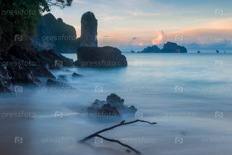 Красивый пейзаж с камнями в море на рассвете провинции Таиланд, Краби