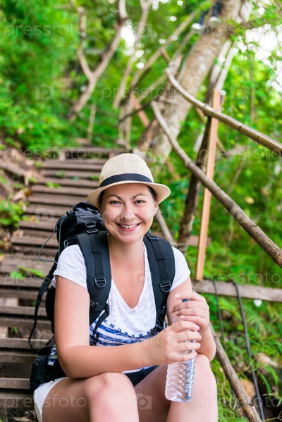 Портрет туриста с бутылкой воды на лестнице