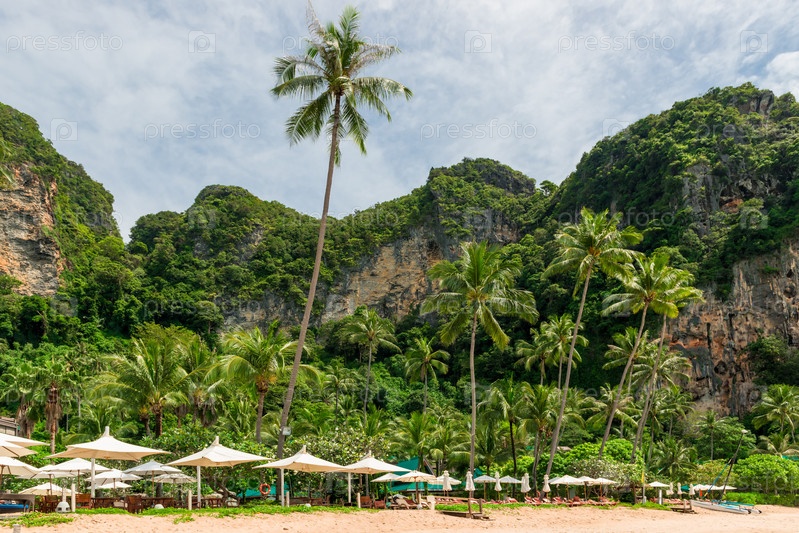 Горы и пальмы на песчаном пляже в Таиланде