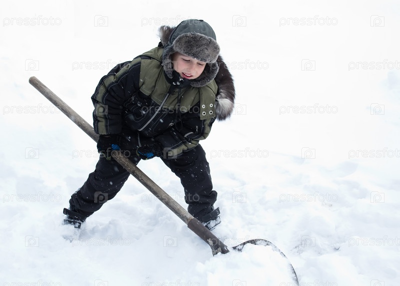 Ребенок чистит снег лопатой