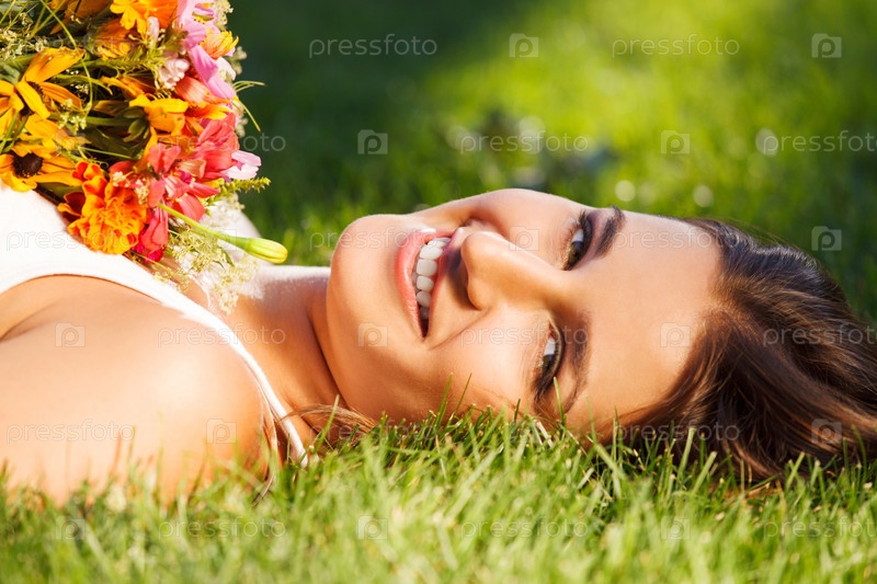 Красивая молодая девушка расслабляется на зеленой траве