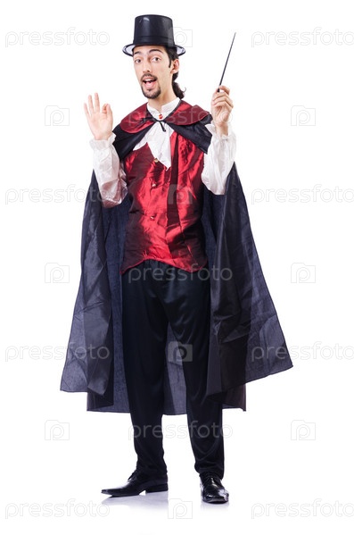 Волшебник с волшебной палочкой на белом фоне