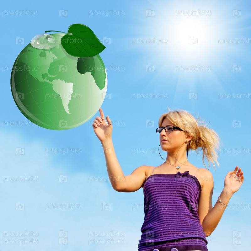 Молодая девушка и зеленый глобус с листиком дерева в каплях дождя на фоне голубого облачного неба. Экология концепция