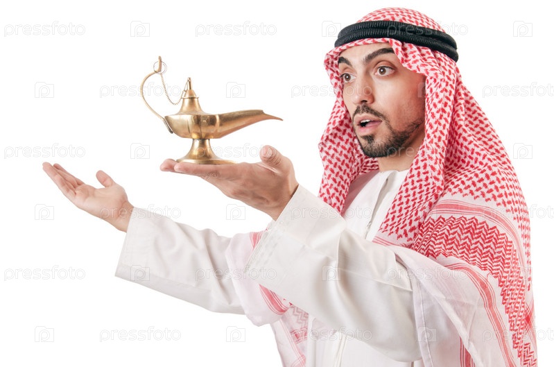 Арабский мужчина с лампой, изолированный на белом
