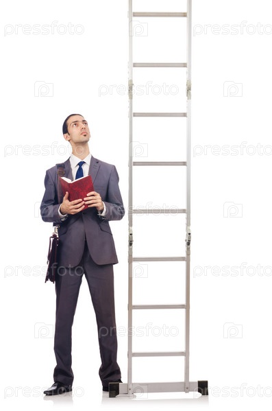 Бизнесмен поднимается по карьерной лестнице на белом фоне