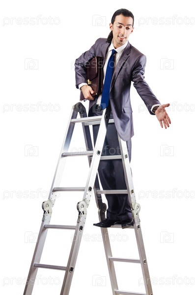 Бизнесмен поднимается по карьерной лестнице на белом