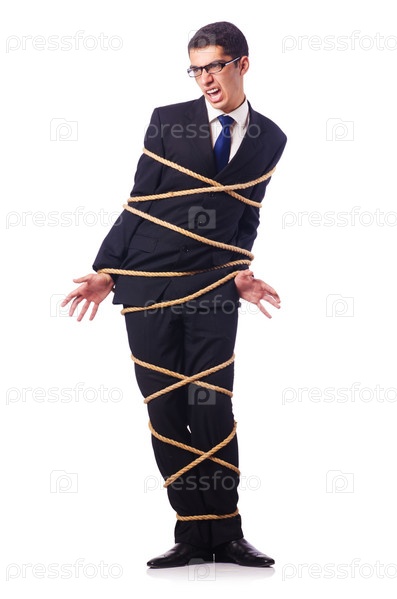 Бизнесмен, связанный веревкой, на белом фоне