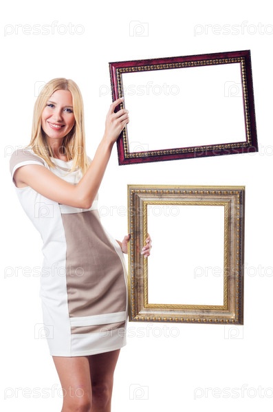 Женщина с фоторамками на белом фоне