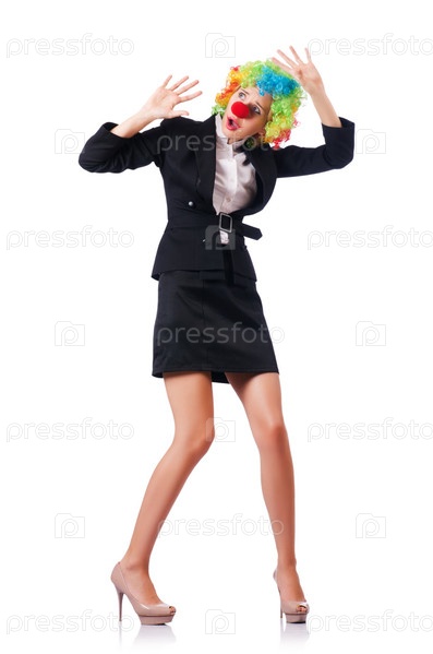 Бизнес-леди в шутовском костюме на белом фоне