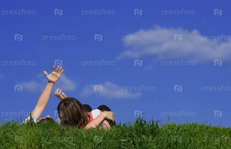 Молодая пара лежит в траве на фоне синего неба