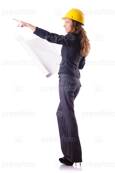 Женщина-строитель в каске на белом фоне