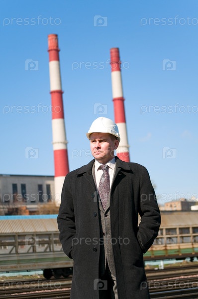 Бизнесмен в шлеме на заводе