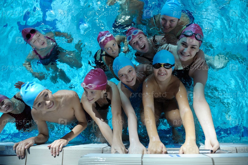 Счастливые дети в плавательном бассейне