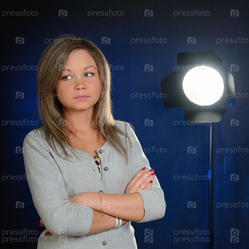 Серьезная девушка на синем фоне