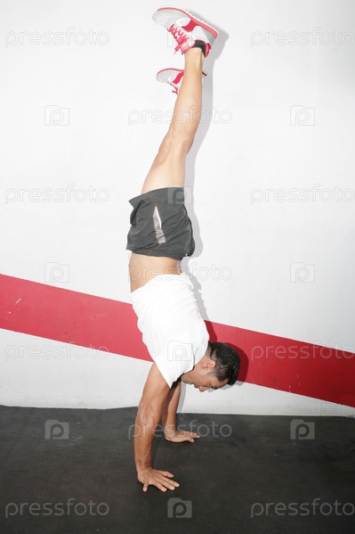 Мужчина делает гимнастическую стойку в тренажерном зале