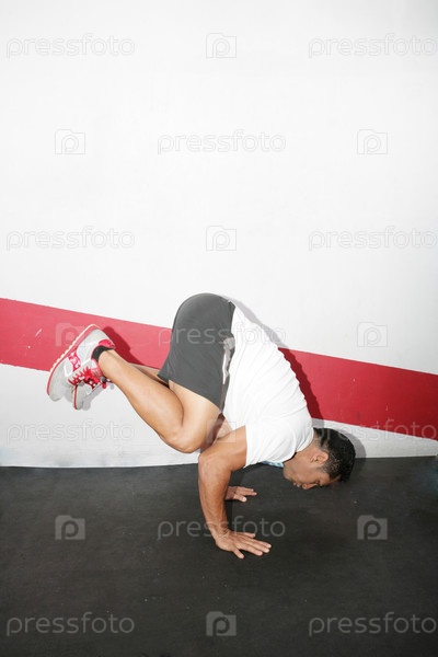 Мужчина делает гимнастическую стойку в тренажерном зале