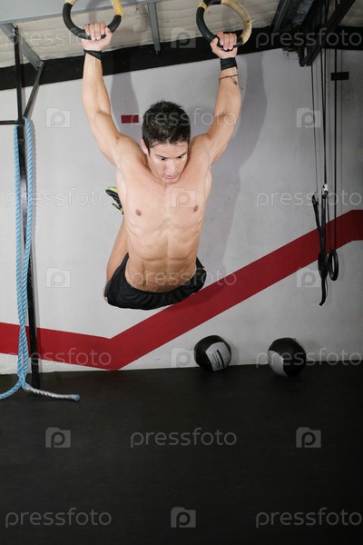 Мужчина занимается кроссфитом на кольцах на темном фоне