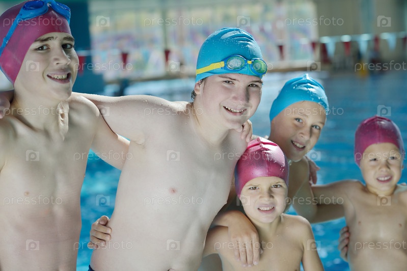 Группа счастливых детей в плавательном бассейне