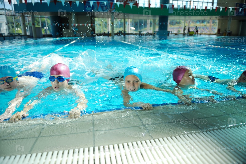 Группа счастливых детей в плавательном бассейне