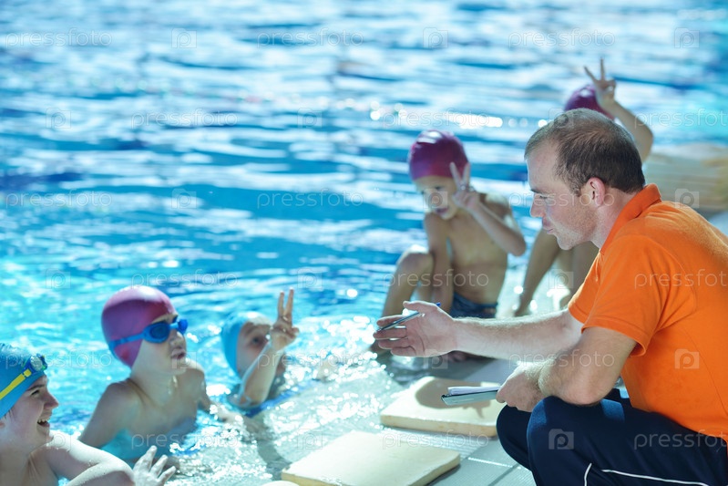 Группа счастливых детей в плавательном бассейне
