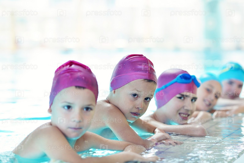 Группа счастливых детей в плавательном бассейне