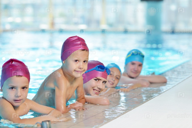 Группа счастливых детей в плавательном бассейне