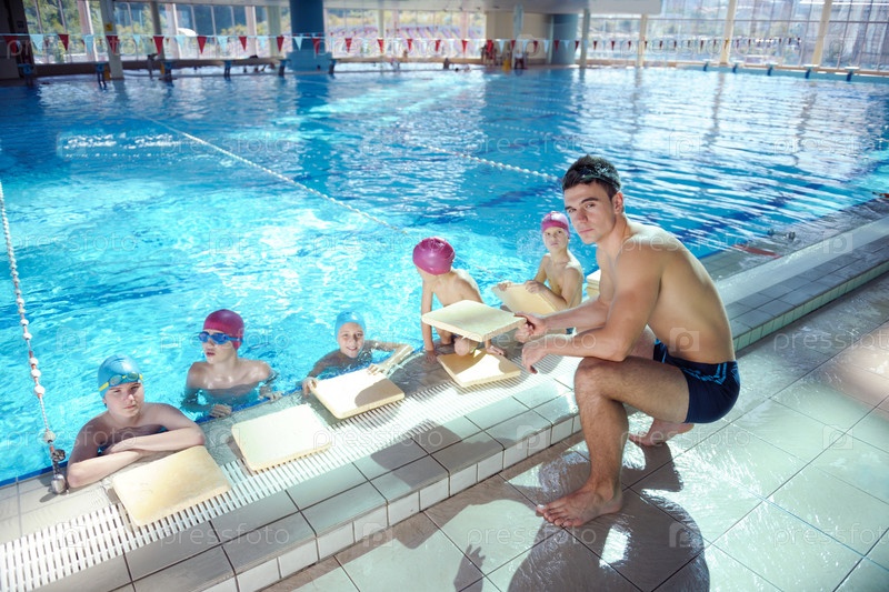 Группа счастливых детей в плавательном бассейне