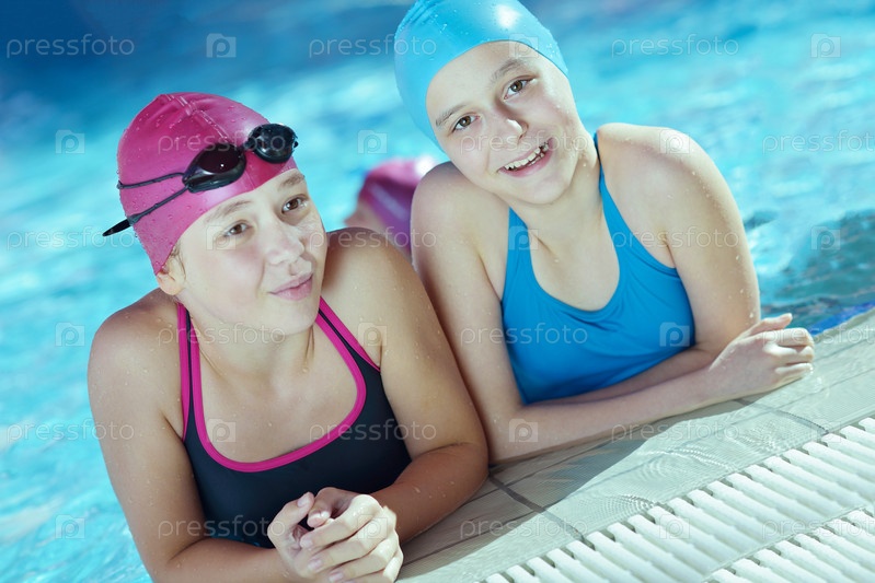 Группа счастливых детей в плавательном бассейне