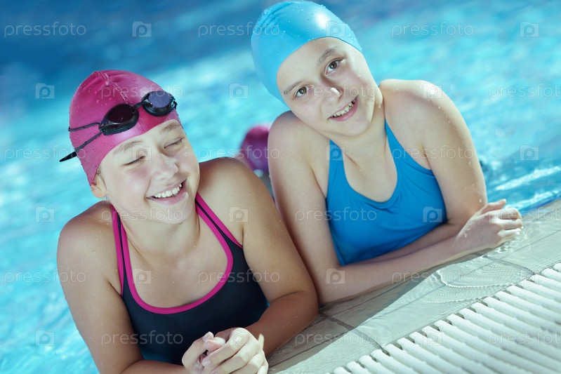 Группа счастливых детей в плавательном бассейне