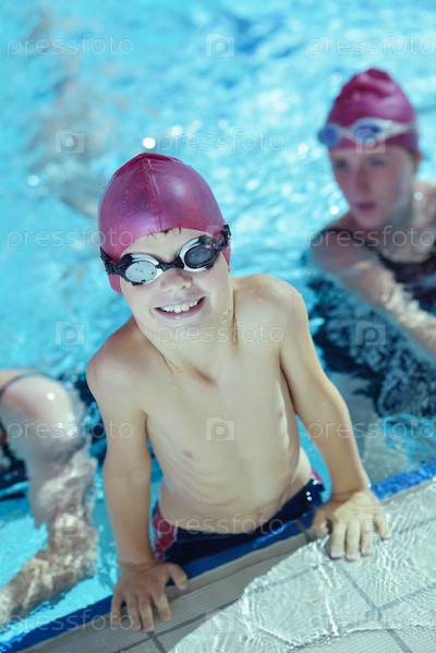 Группа счастливых детей в плавательном бассейне