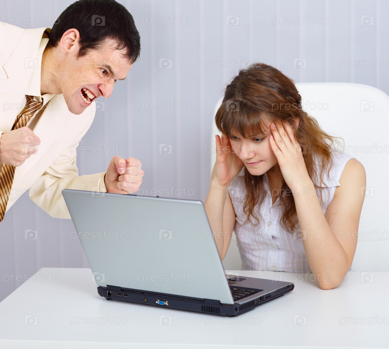 Раздраженный начальник и секретарь с ноутбуком
